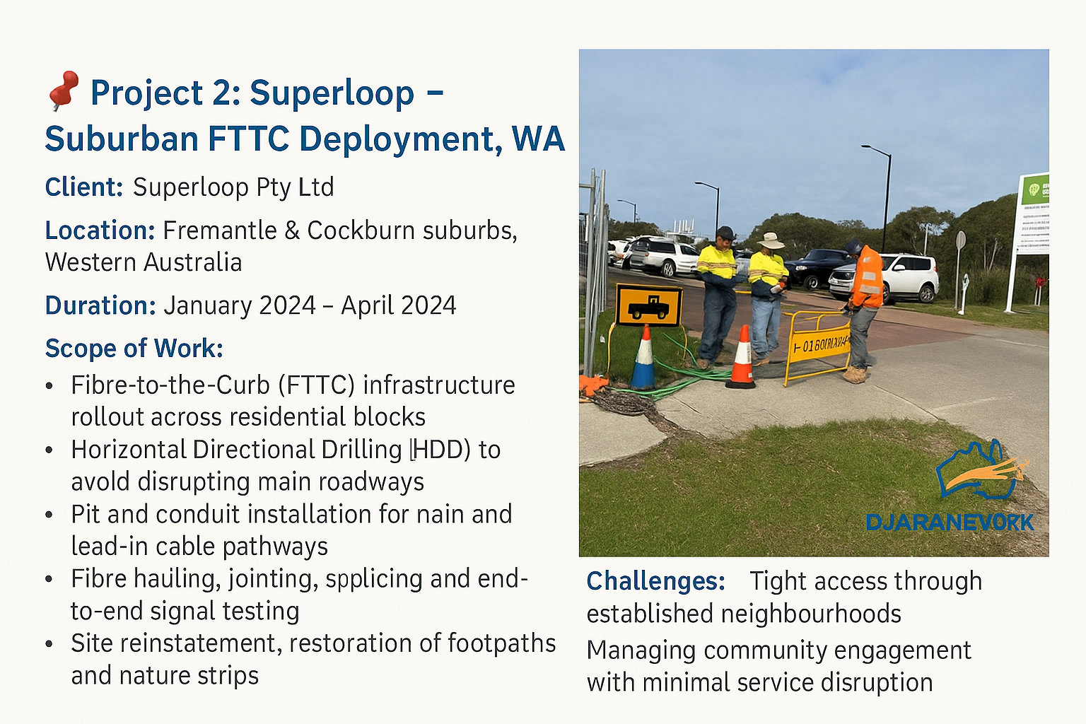 DJARANETWORK SERVICE PTY LTD is a professional telecommunications infrastructure and network engineering company based in Australia.